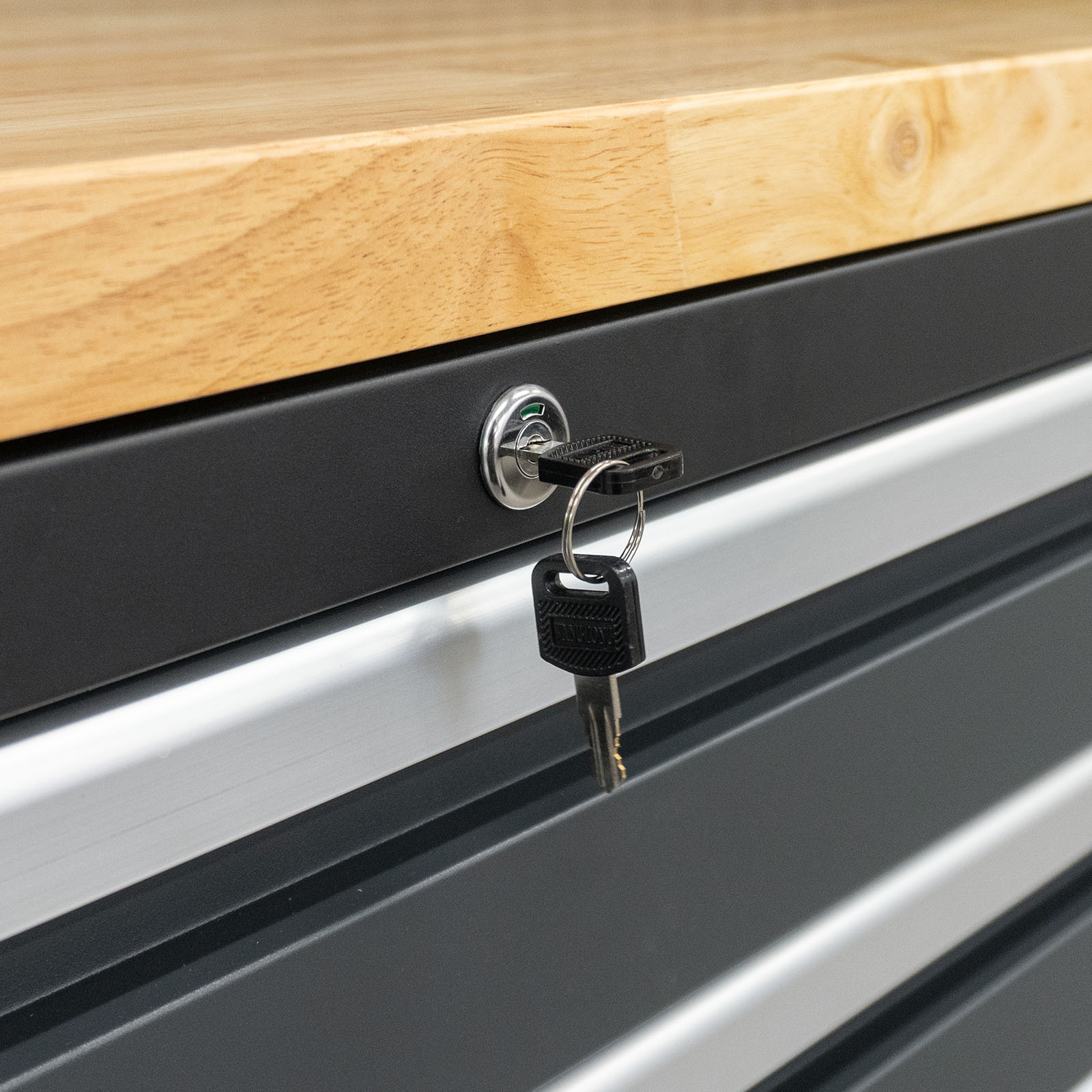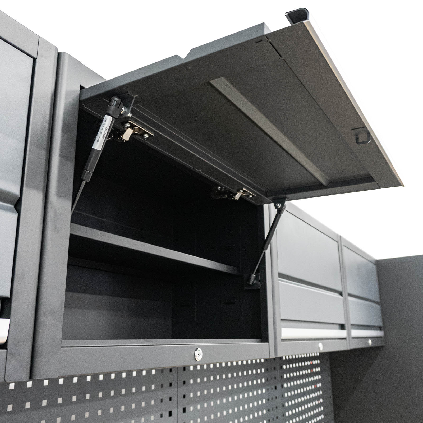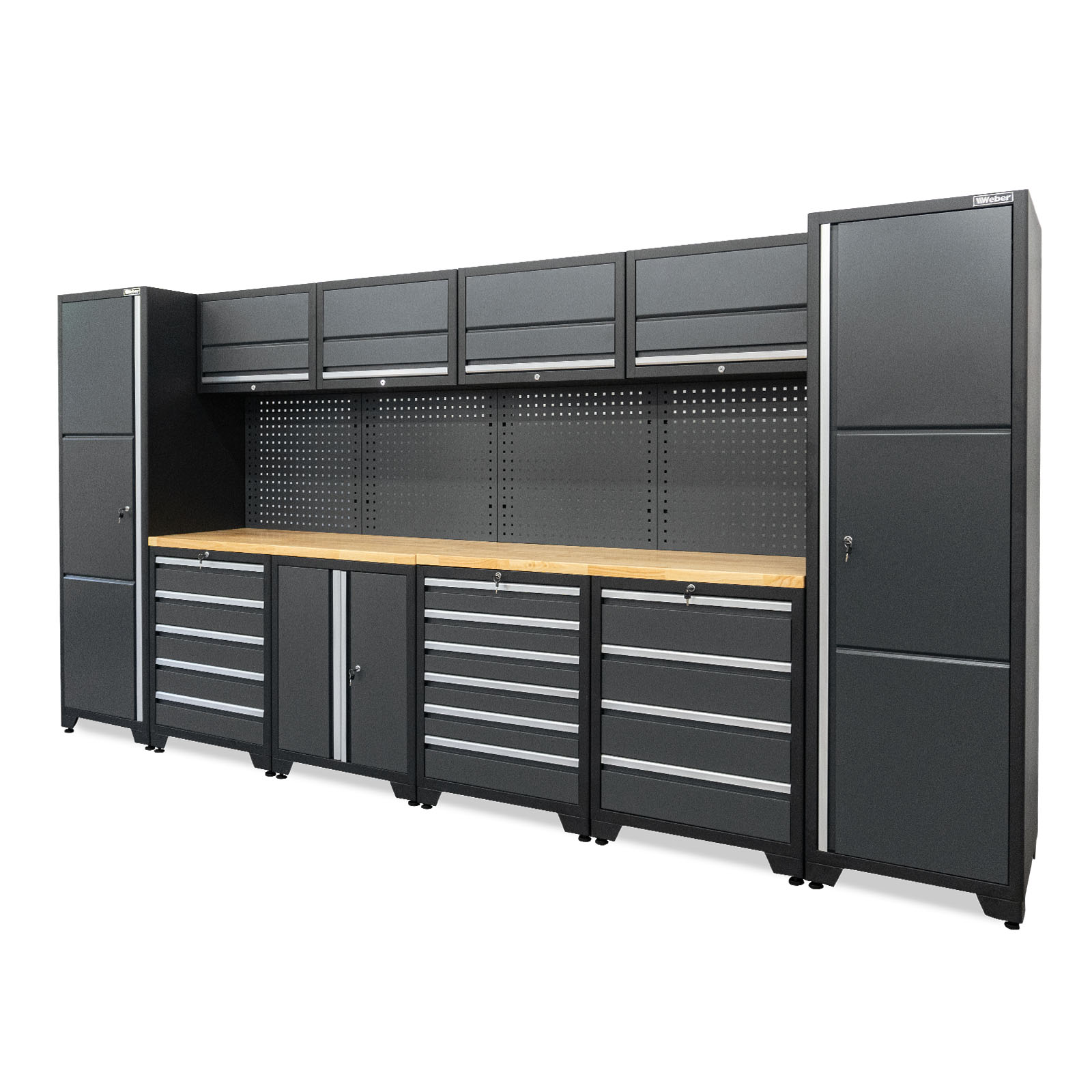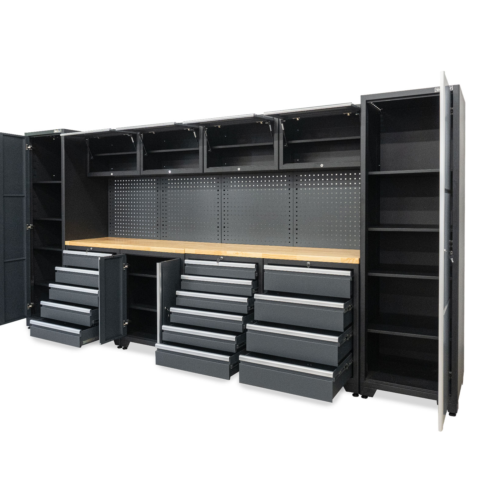 Das moderne, 16-teilige Werkstatt Schranksystem der Serie 610 mit 600 mm tiefer Arbeitsplatte ist ideal für ein professionelles, produktives Arbeiten in Werkstatt oder Garage geeignet und lässt sich dank modularer Bauteile flexibel zusammenstellen. Es sind vier obere Staufächer vorhanden, welche mit stabilen Gasdruckfedern ausgestattet sind, um ein weiches Öffnen und Schliessen zu gewährleisten. Die beiden großen Hochschränke sind jeweils mit drei höhenverstellbaren Einlegeböden versehen. Die solide Werkbank mit 38 mm Stärke bietet genügend Arbeits- und Ablagemöglichkeiten. An der hinteren Lochwand können Werkzeuge aufgehangen werden. Unter der Werkbank befinden sich drei Schubladenschränke mit stabilen, kugelgelagerten Schubladen sowie ein Schrank mit Türen und einem Einlegeboden. Alle Schubladen und Schränke verriegeln magnetisch und lassen sich abschließen. Die Arbeitsplatte aus Holz ist mit einer schützenden Schicht versiegelt, was die Platte widerstandsfähig und unempfindlich gegen Beschädigungen und Verunreinigungen macht. Um die Schrankwand in Waage aufzustellen sind die Füße höhenverstellbar. Für den Einbau in Fahrzeugen oder Anhängern können die Füße und Plastikabdeckungen weggelassen werden. Dank speziellen Halterungen, kann das System an der Wand verschraubt werden, es steht aber auch hervorragend ohne Befestigung. Ein optionales LED Beleuchtungssystem zur Ausleuchtung der Arbeitsfläche kann an den Oberschränken angebracht werden.